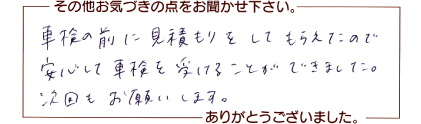 車検の前に見積もりをしてもらえたので安心して車検を受けることができました。次回もお願いします。松山市 S.K.さま