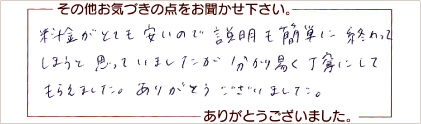 料金がとても安いので説明も簡単に終わってしまうと思っていましたが、分かり安く丁寧にしてもらえました。ありがとうございました。松山市 E.A.さま